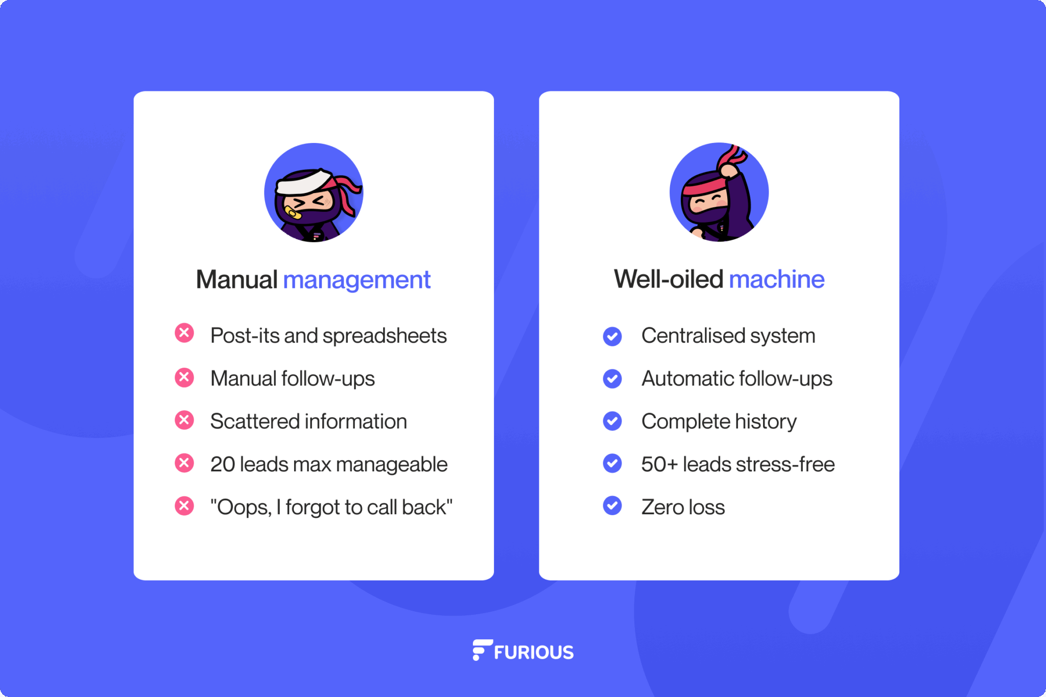 Ja, denn Furious wurde entwickelt, um das Vertriebschaos in Agenturen zu beseitigen. Automatisierungen, Vorlagen, KI-Erinnerungen, visuelle Priorisierung: Alles ist zentralisiert, damit sich Ihre Teams auf das konzentrieren können, was sie am besten können – verkaufen.