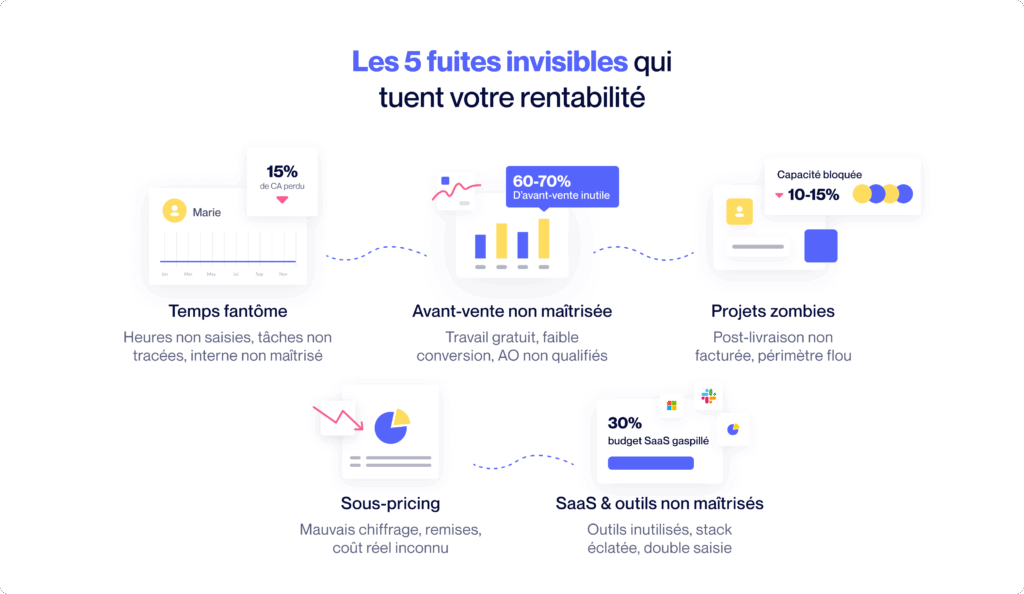 | 1. Temps fantôme | Heures non saisies, tâches non tracées, interne non maîtrisé | Jusqu’à 15% de CA perdu, 130 h/mois envolées, soit 9 100 € → 182 000 €/an en moyenne |